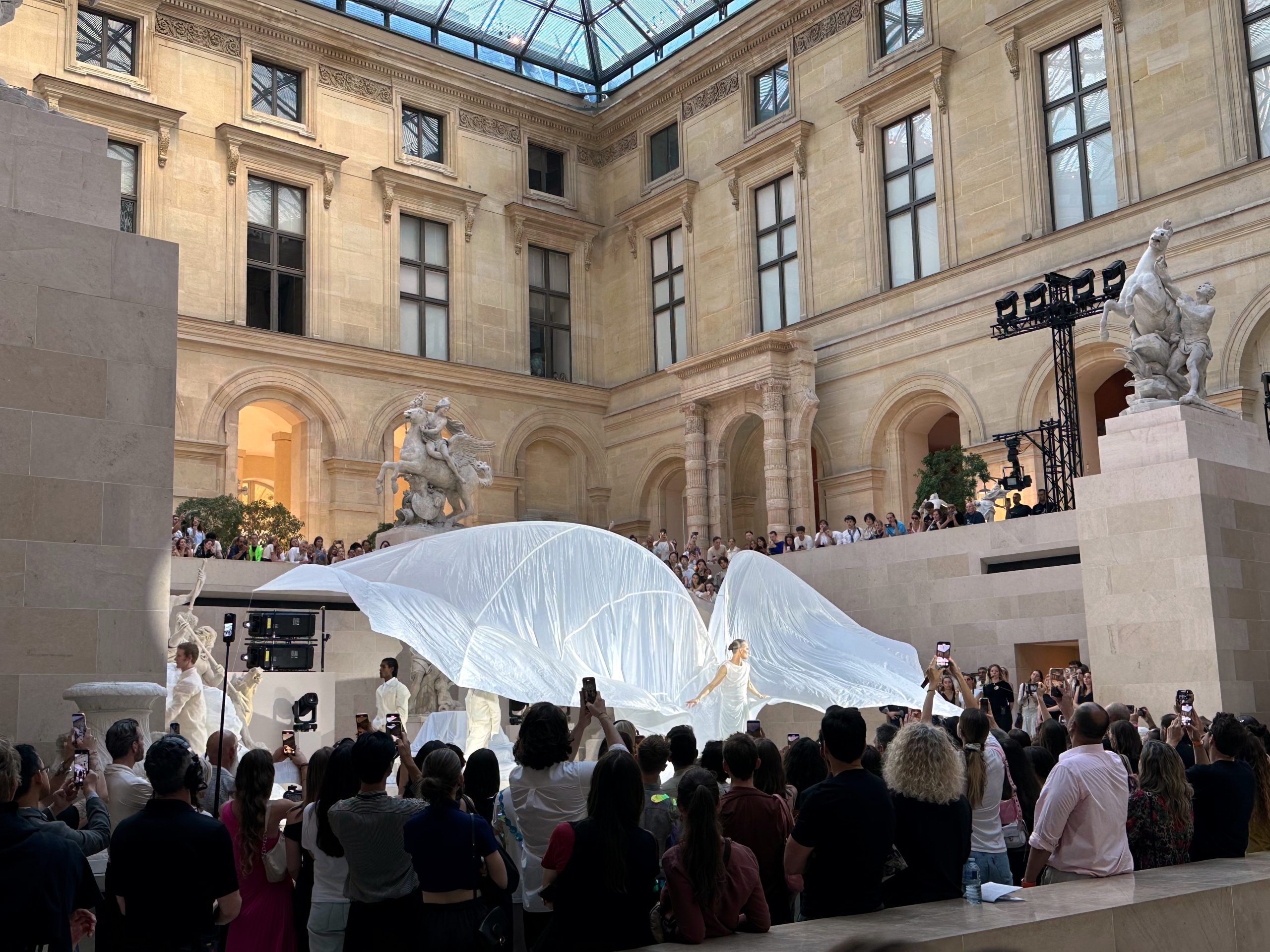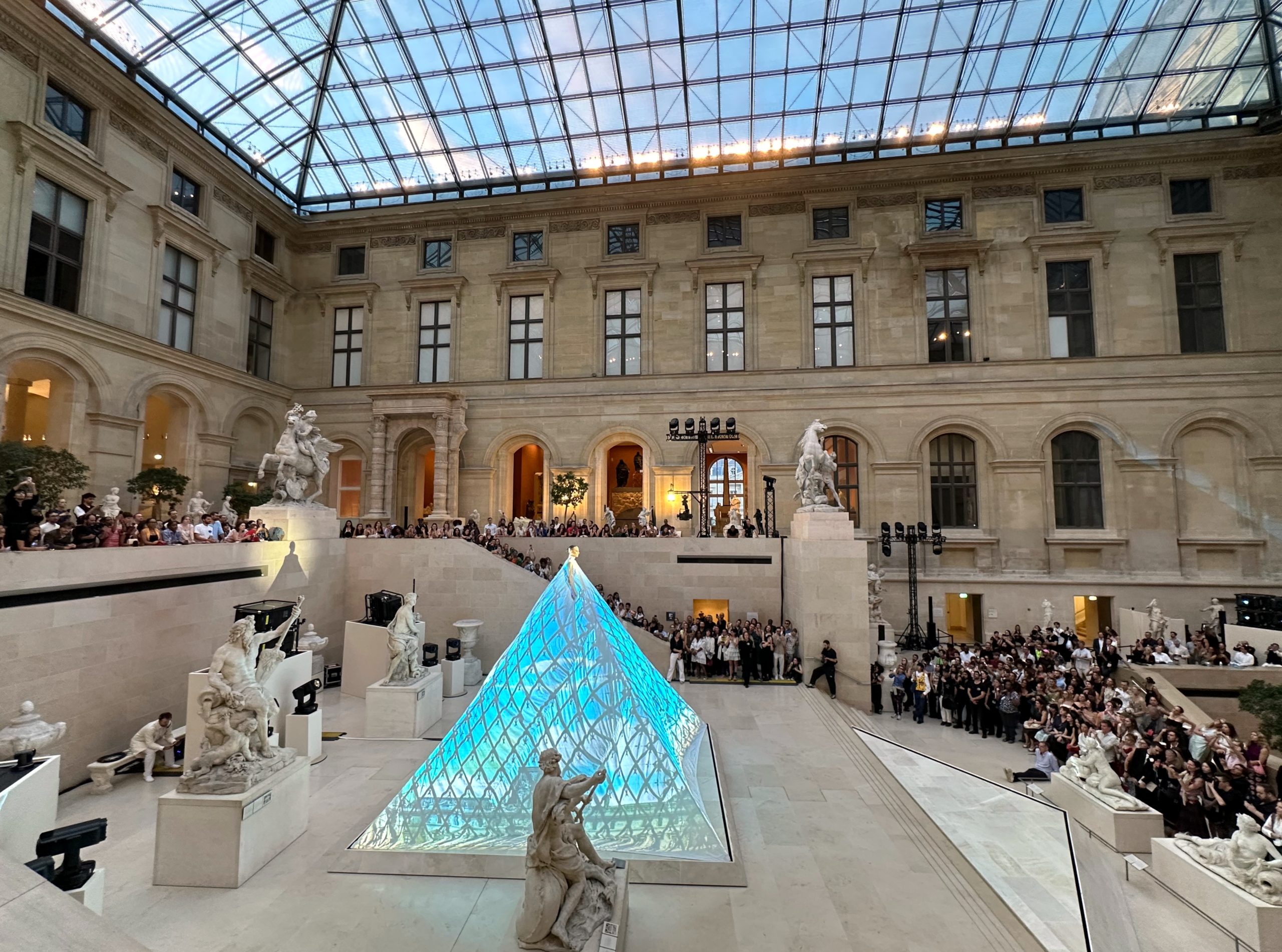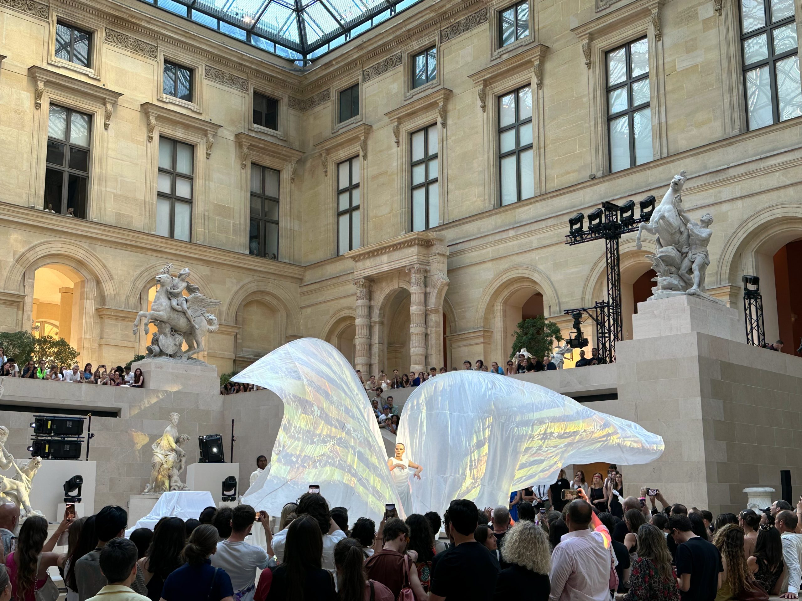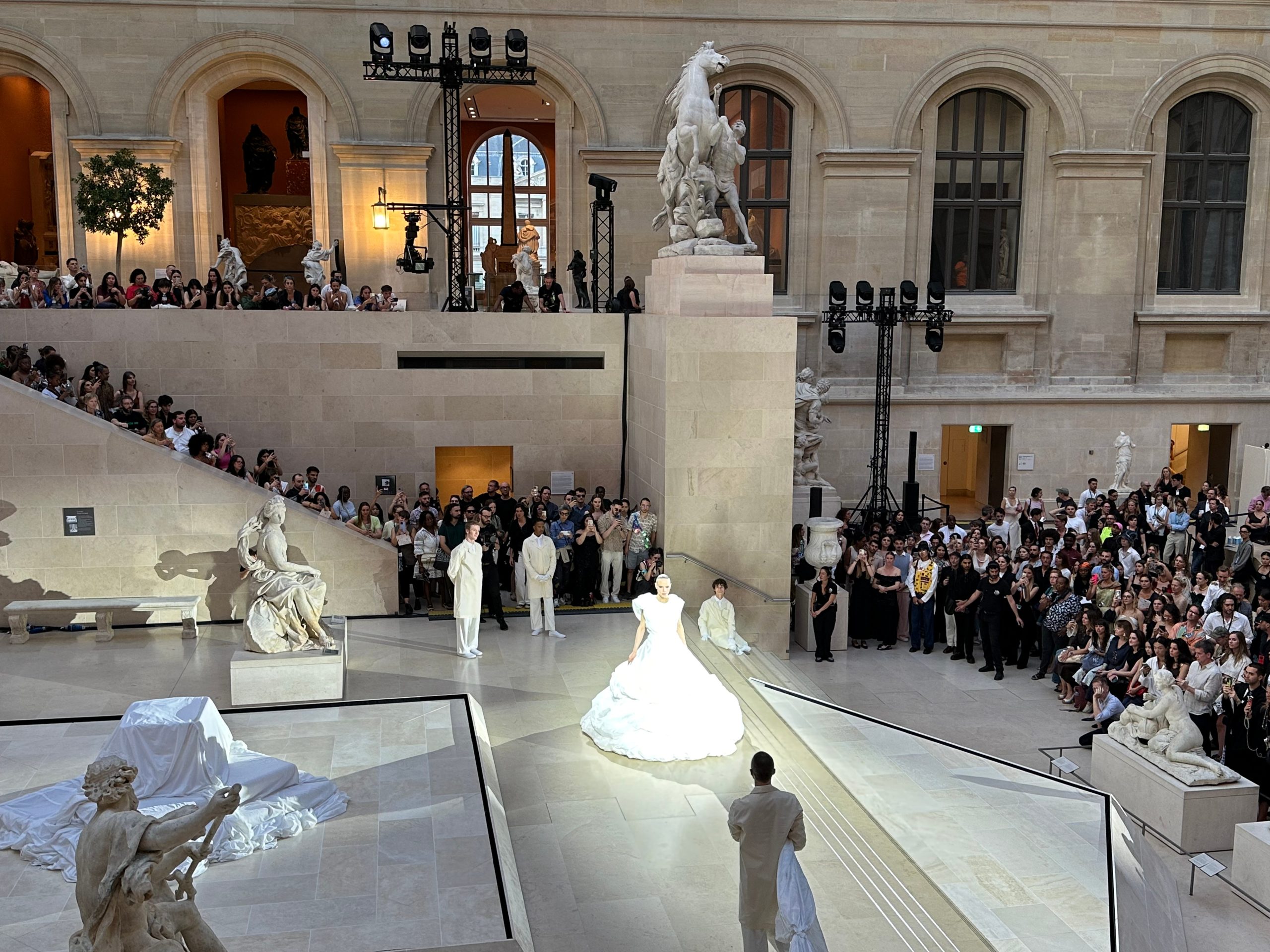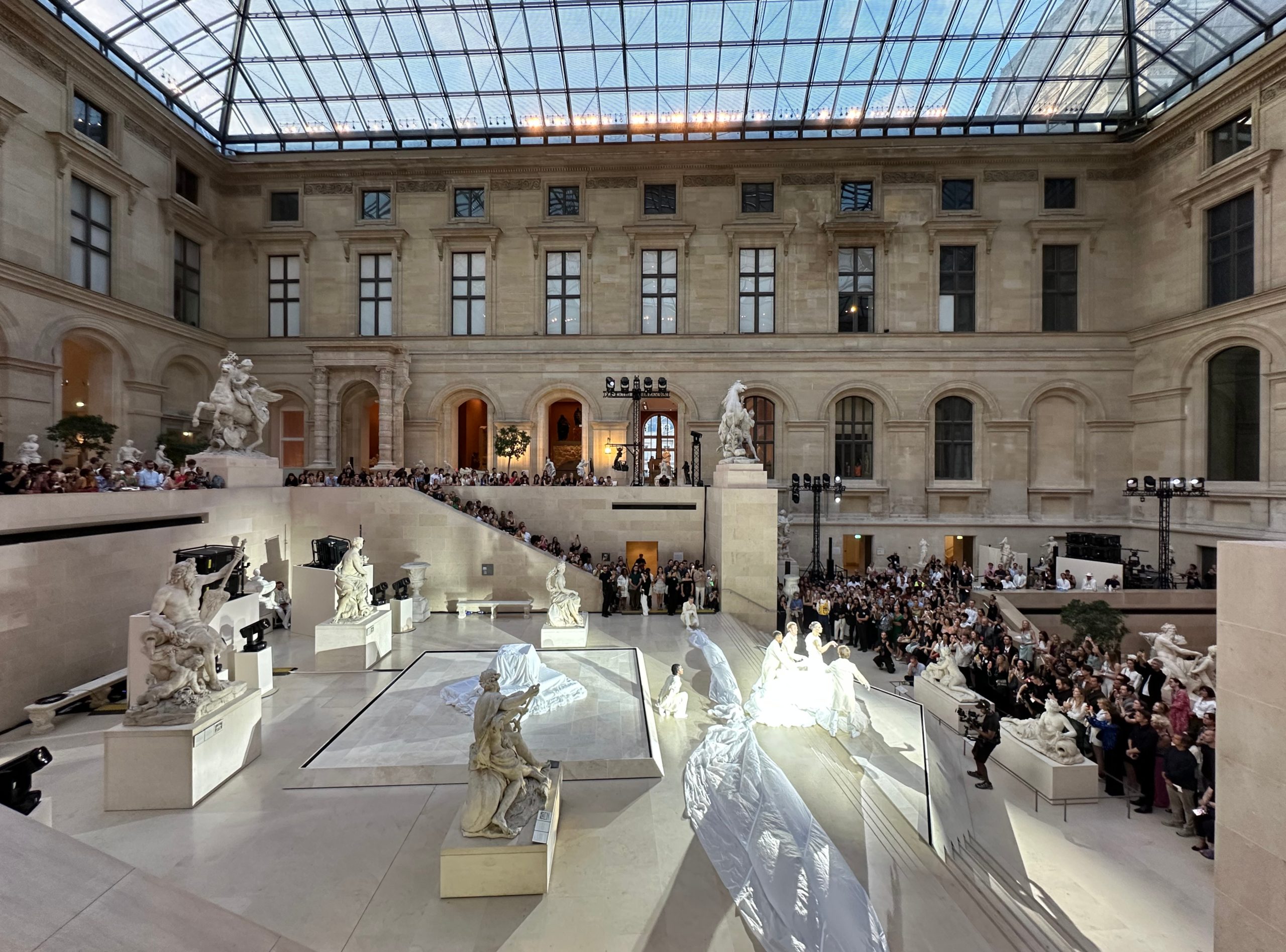 L’événement s’est déroulé dans la Cour Marly, un espace qui sert de lien entre l’architecture classique du musée et la nouvelle exposition Louvre Couture.